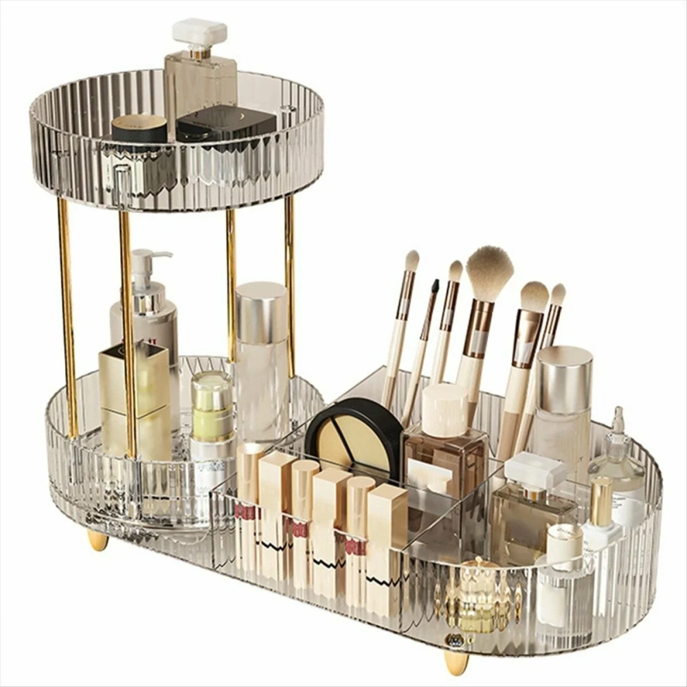 [Вращающийся органайзер для косметики] Этот органайзер для косметики и парфюмерии имеет 2 вращающихся лотка для косметики, которые плавно и бесшумно вращаются на 360°. Вы можете легко получить доступ к содержимому и разместить его, просто слегка повернув лотки.