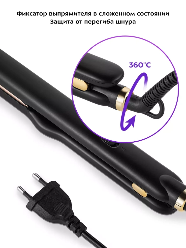 Шнур оснащен защитой от перегиба, что увеличивает срок службы прибора. На защите от перегиба находится петля, за которую удобно повесить устройство при хранении. Вращение шнура на 360° обеспечивает удобство в использовании выпрямителя для волос — провод не сматывается и не путается при повороте устройства, а поворачивается вместе с ним.