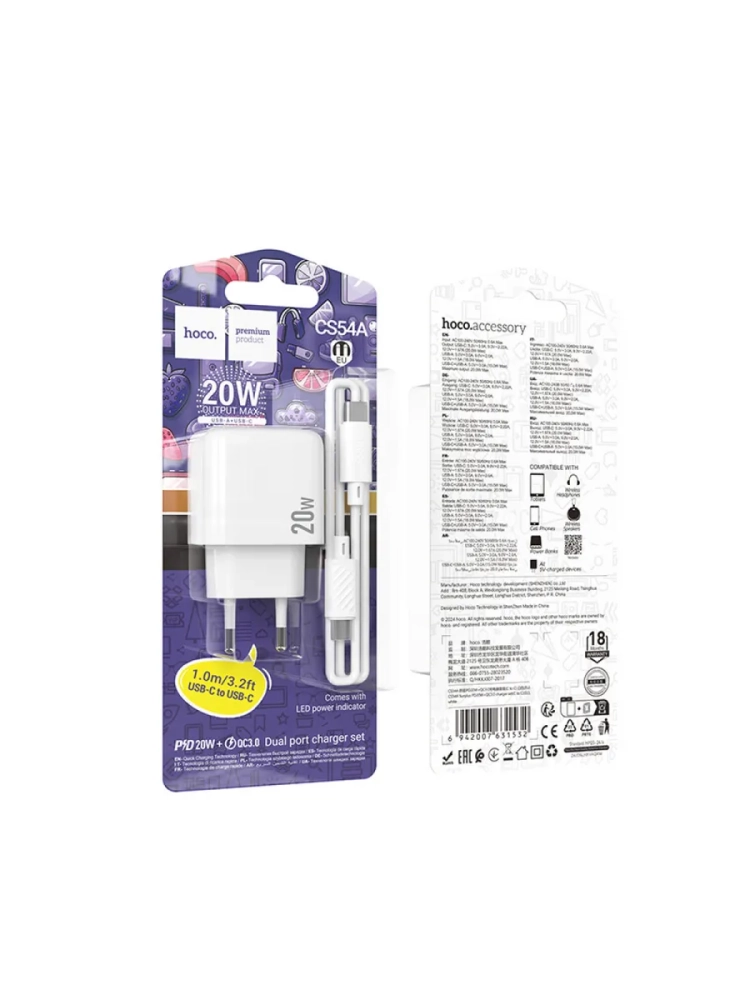 Кабель в комплекте: в комплект поставки входит 1-метровый кабель для зарядки от Type-C до Type-C, что позволяет удобно подключать устройства к зарядному устройству. HOCO CS54A идеально подходит для зарядки смартфонов, планшетов и других электронных устройств, поддерживающих технологию быстрой зарядки. Благодаря компактным размерам и поддержке быстрой зарядки, это СЗУ станет незаменимым помощником в повседневной жизни.