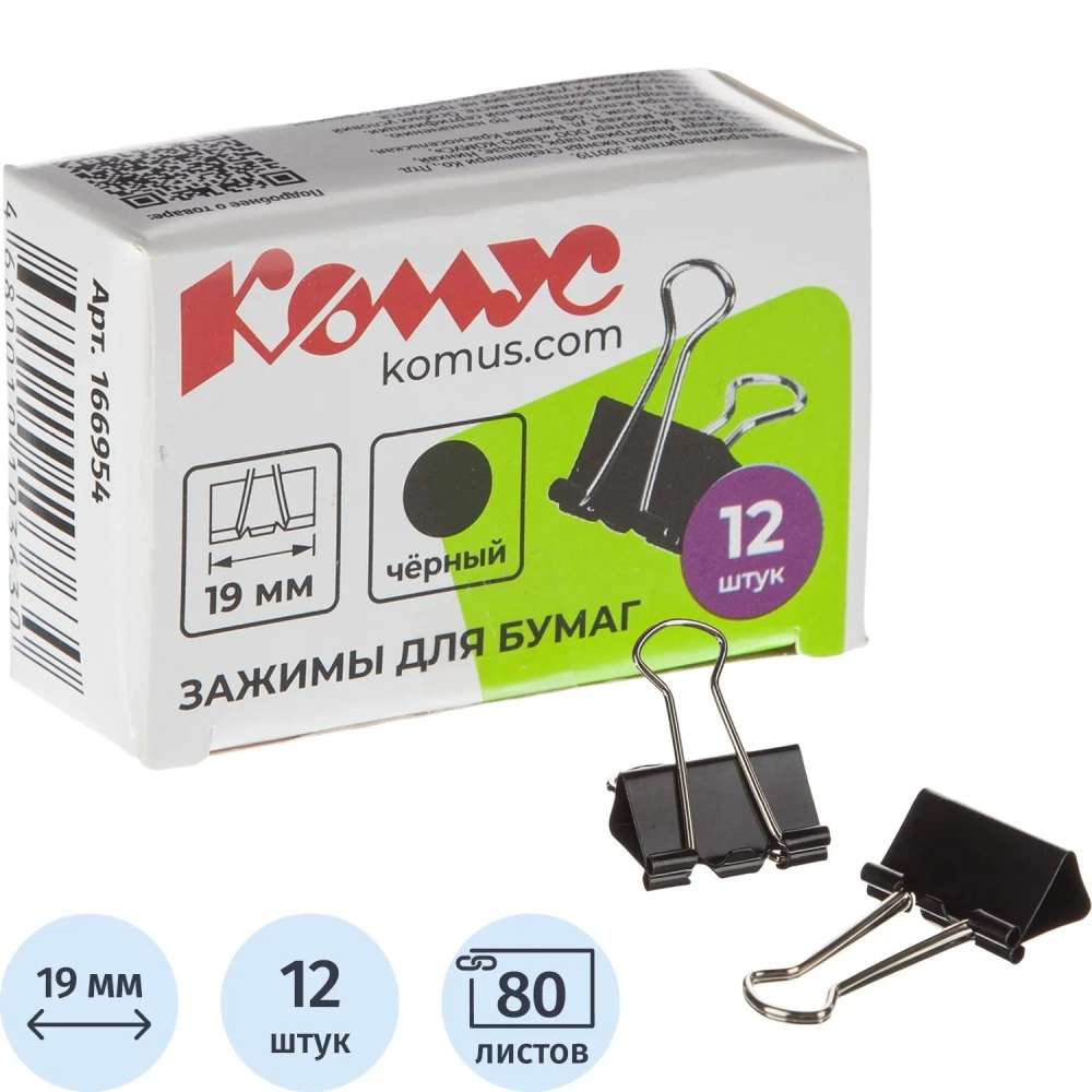 Зажимы для бумаг 19мм 12шт./уп. Комус, в картонной коробке