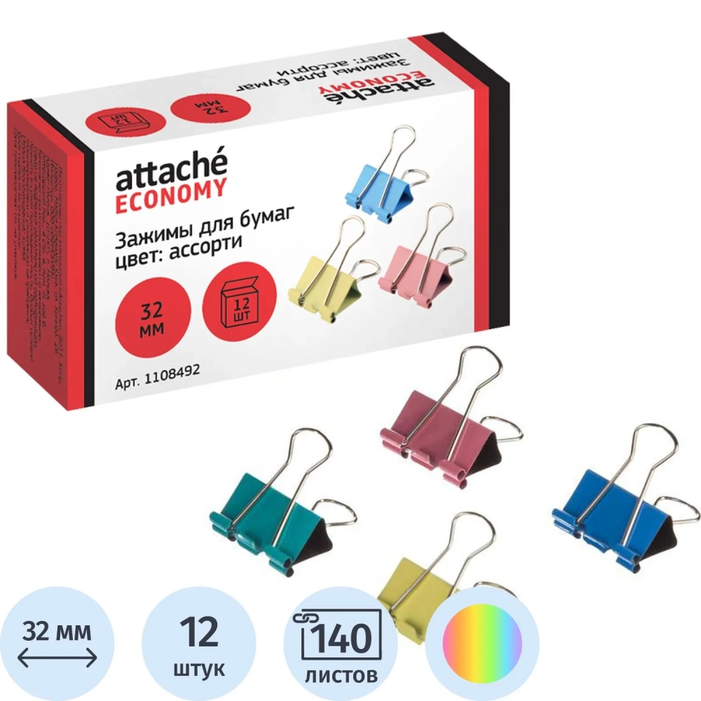 Зажимы для бумаг 32мм 12шт/уп, цветные, в карт.коробке