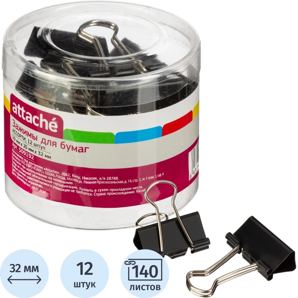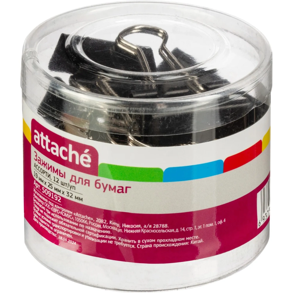 Зажимы для бумаг ассорти (19мм,25мм,32мм), 12шт/уп Attache, пласт.бокс
