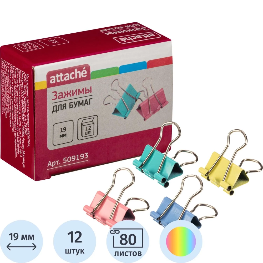 Зажимы для бумаг цветные 19мм 12шт/уп Attache, в картонной коробке