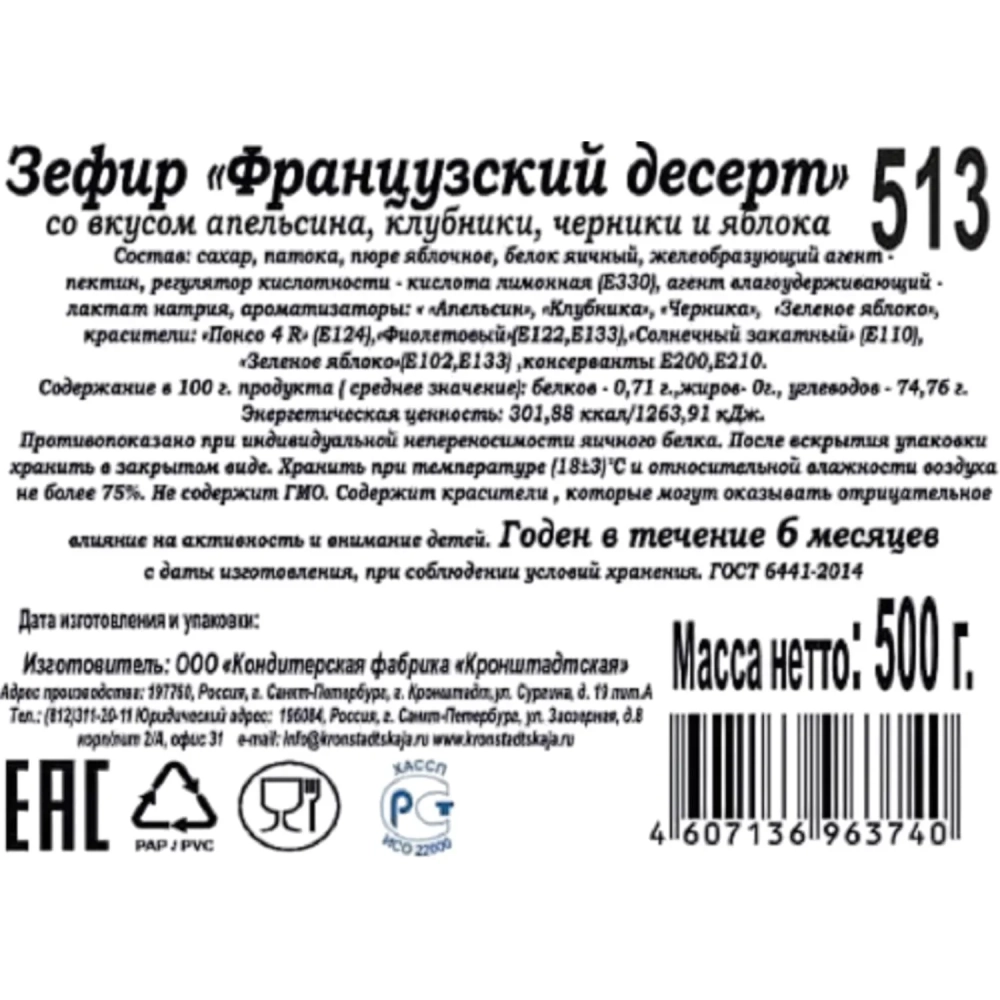 Зефир КФ Кронштадтская Франц. десерт со вкус. апельс.,клуб.,черн.и ябл.500г