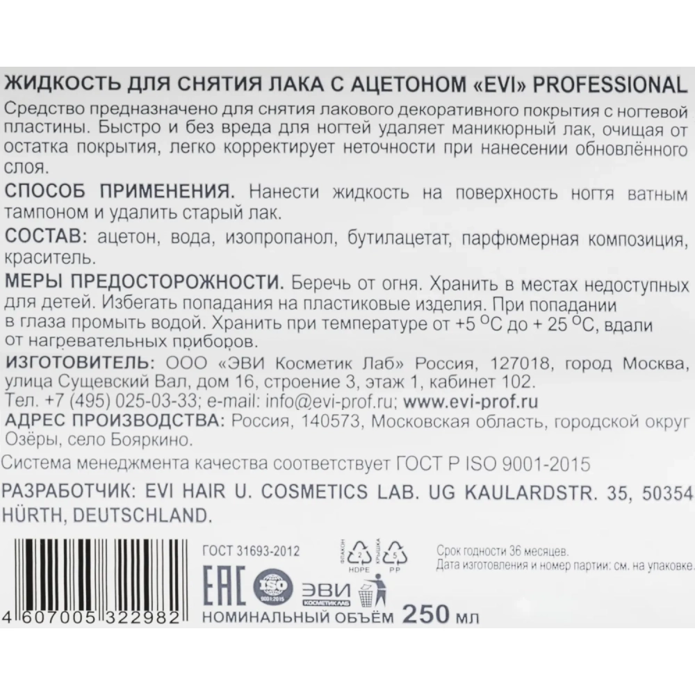 Жидкость для снятия лака EVI professional с ацетоном 250мл