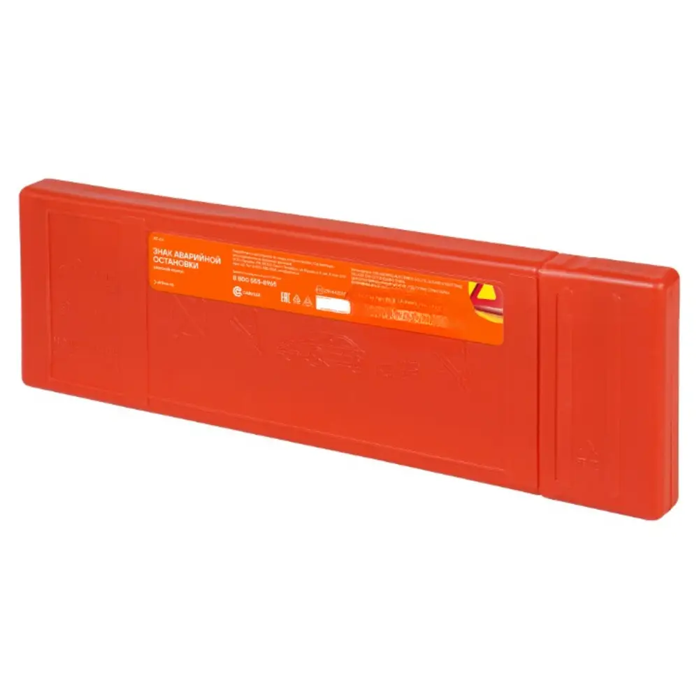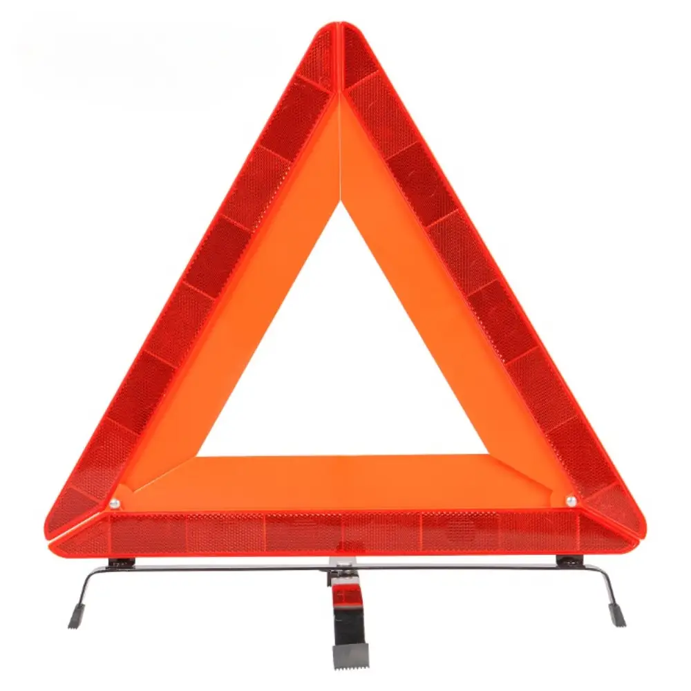 Знак аварийной остановки, представляет собой равносторонний треугольник. Внешняя сторона этого треугольника обклеивается полосой, изготовленной из светоотражающего материала. Это необходимо для того, чтобы он был заметен другим водителям с дальнего расстояния. Внутренняя сделана из яркого пластика. Данным видом знаков чаще всего комплектуют премиальные модели иномарок. Соответствует ТР ТС 018/2011. Применяется в случаях предусмотренных в ПДД РФ, п.7 "Применение аварийной сигнализации и знака аварийной остановки".