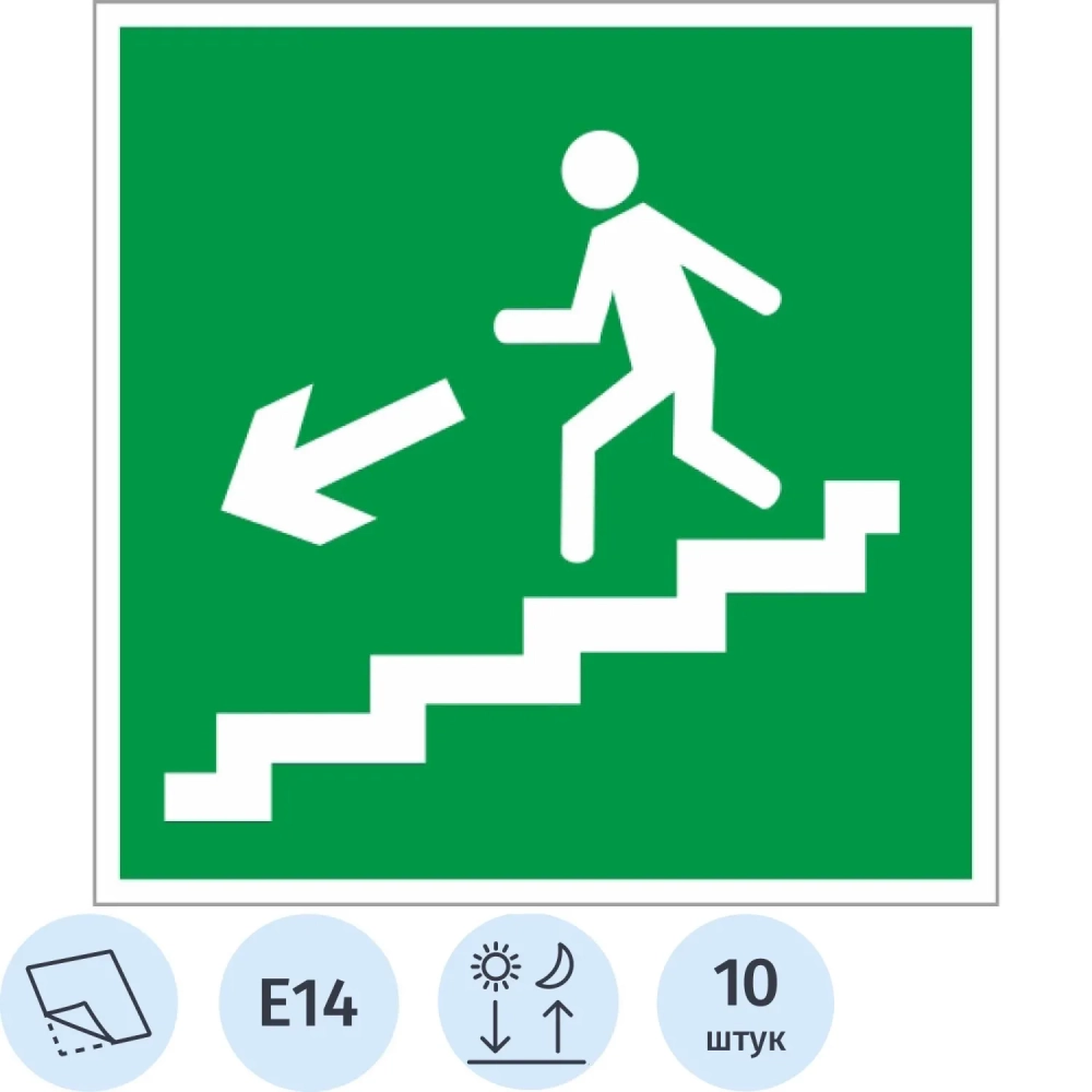 Знак безопасности E14 Напр.эв.вых.по лест.вн/лев,пленка ф/л,200х200 10шт/уп