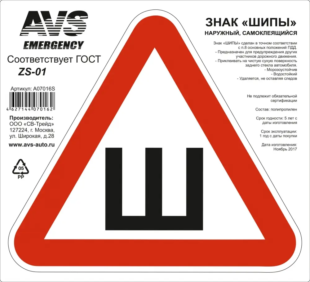 Знак "ШИПЫ" ГОСТ наруж.самоклеящ.AVS ZS-01A (200x200 мм.) 1 шт.