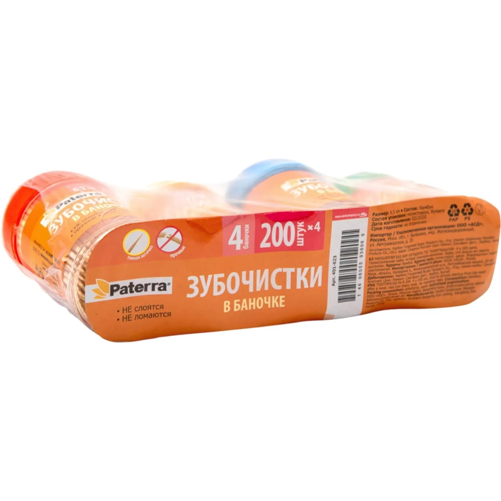 Зубочистки бамбук., PATERRA, 200 шт. в пластиковой баночке, (401-623)