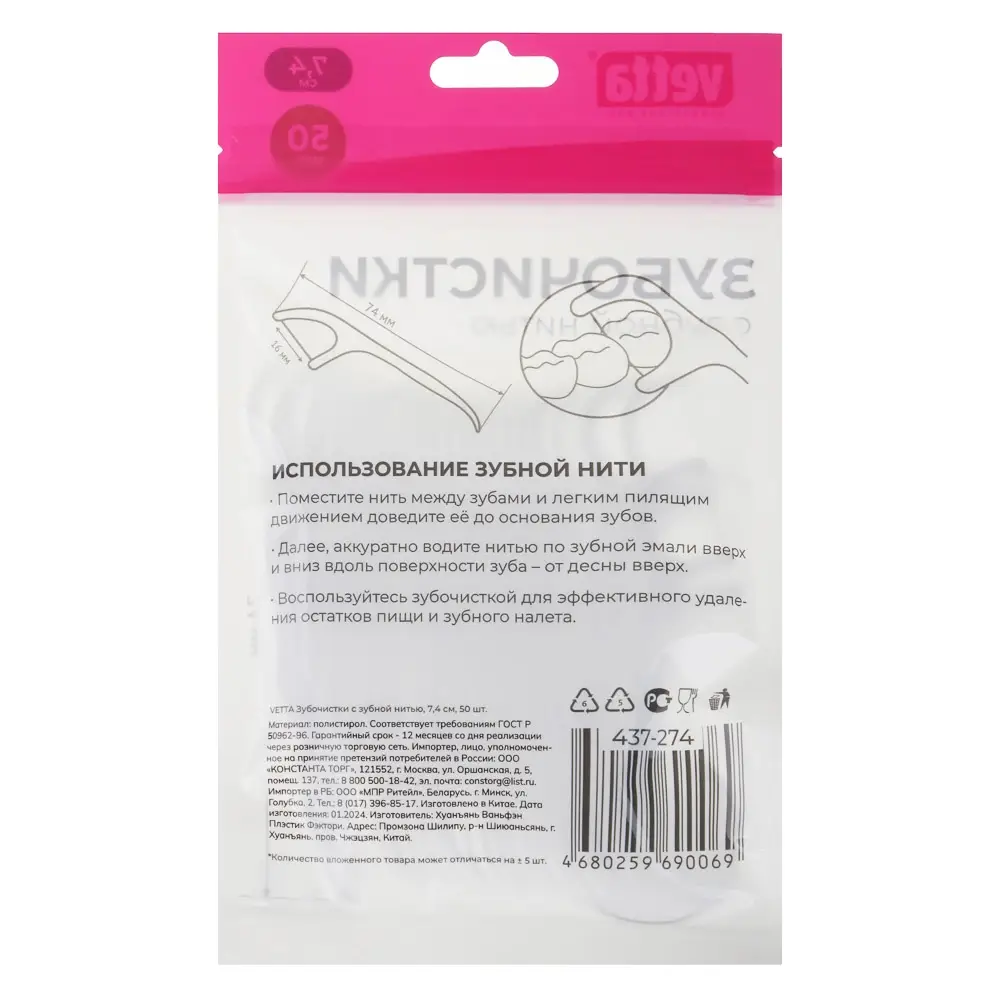 Зубочистки с зубной нитью тм VETTA, полистирол, полиэтиленовое волокно, 7,4см, 50шт